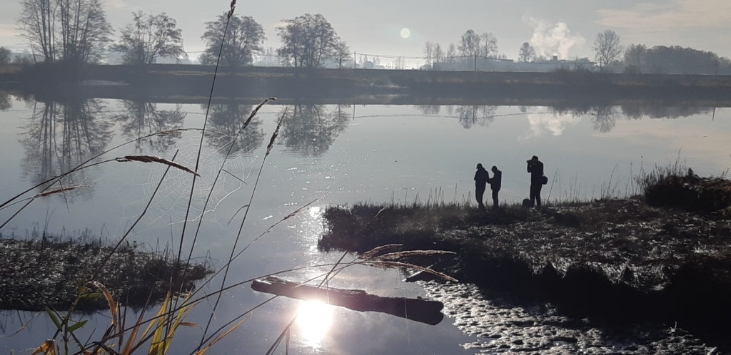 We spent a few minutes exchanging questions and answers about their work – testing the salinity of the mud, if I recall – and I took a few photos of them in silhouette against the river.